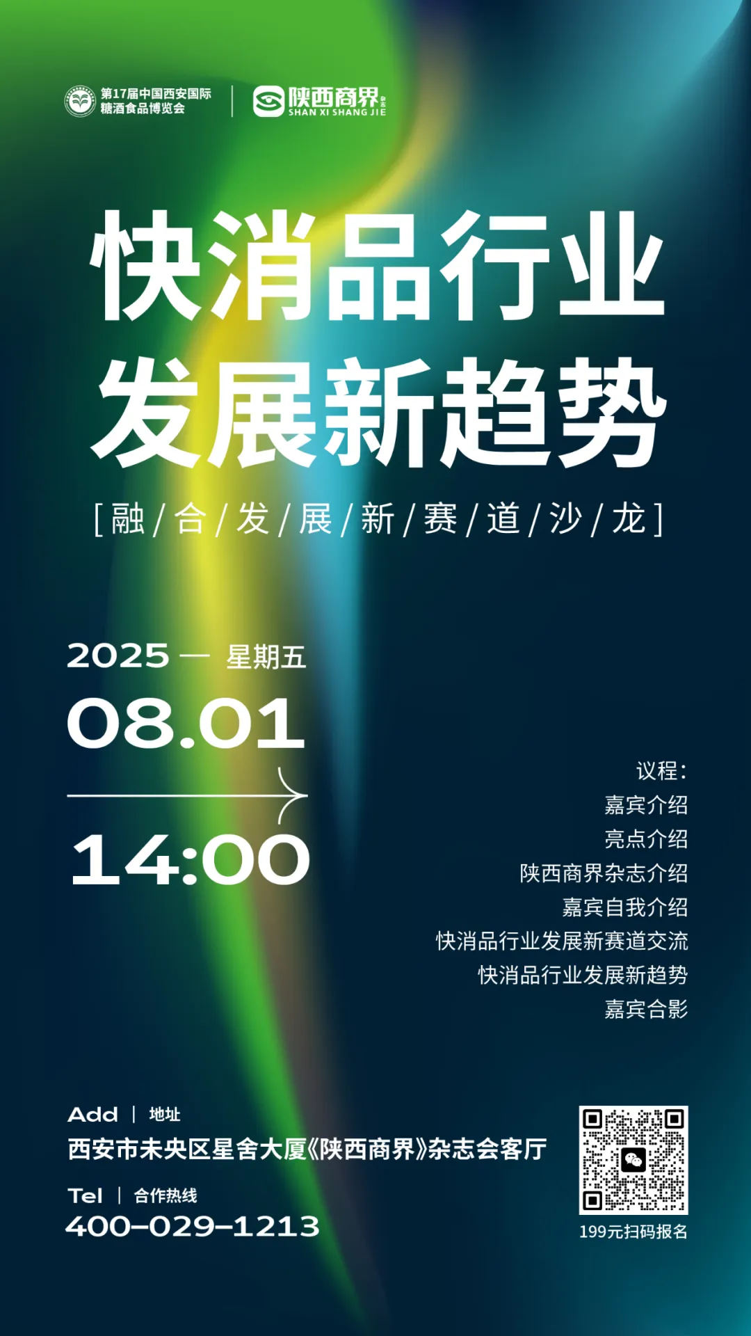 由陜西商界與第17屆中國西安國際糖酒食品博覽會組委會聯(lián)合主辦的"快消品行業(yè)發(fā)展新趨勢——融合發(fā)展新賽道"主題沙龍,將于2025年8月1日下午14:00在西安市未央?yún)^(qū)星舍大廈《陜西商界》雜志會客廳隆重舉行。
