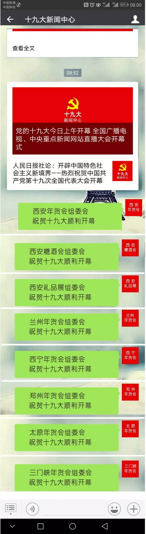 旭峰會展各展會項目組通過電視、網絡、手機等觀看開幕會,并通過微信端表達祝賀。